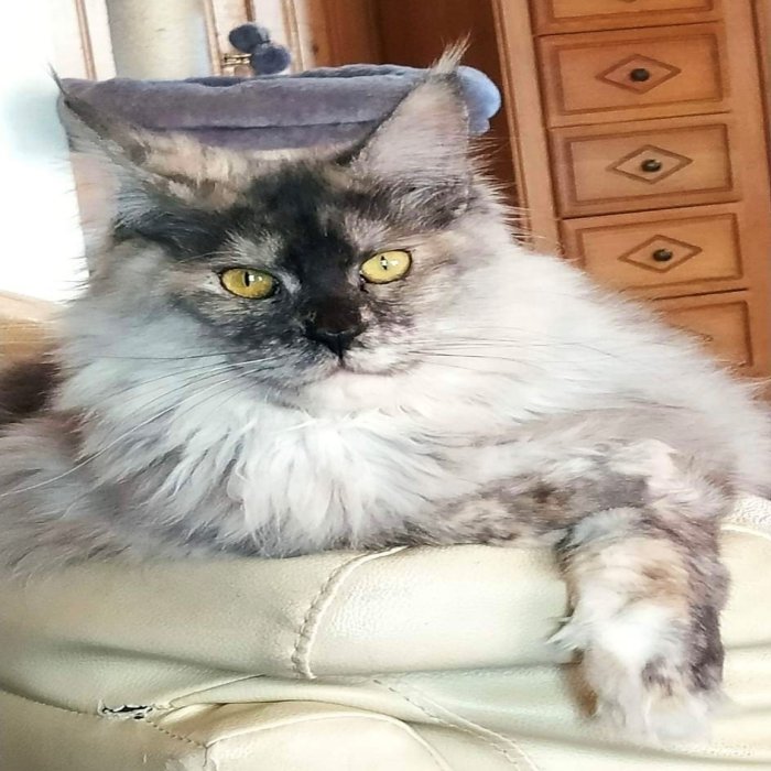Couleur : Blue Silver Tortie Blotched Taby 972274200406854 Yeux : Ambre Femellle Réside à Villers-le-Bouillet |